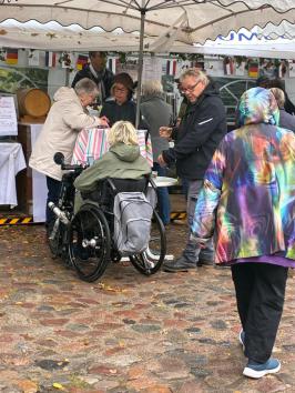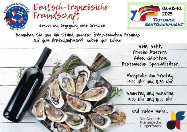 Unsere französischen Gäste bereicherten den Erntedankmarkt mit Crêpes, Fleur de Sel, Muscadet, leckerem Rosé- und Rotwein, französischem Sekt und Austern. Das Angebot am Stand der Franzosen wurde erstmals ergänzt durch eine Fotopräsentation unserer Verschwisterungsgemeinde. Es gab zweimal täglich eine Weinverkostung und ein Quiz mit Gewinnen.